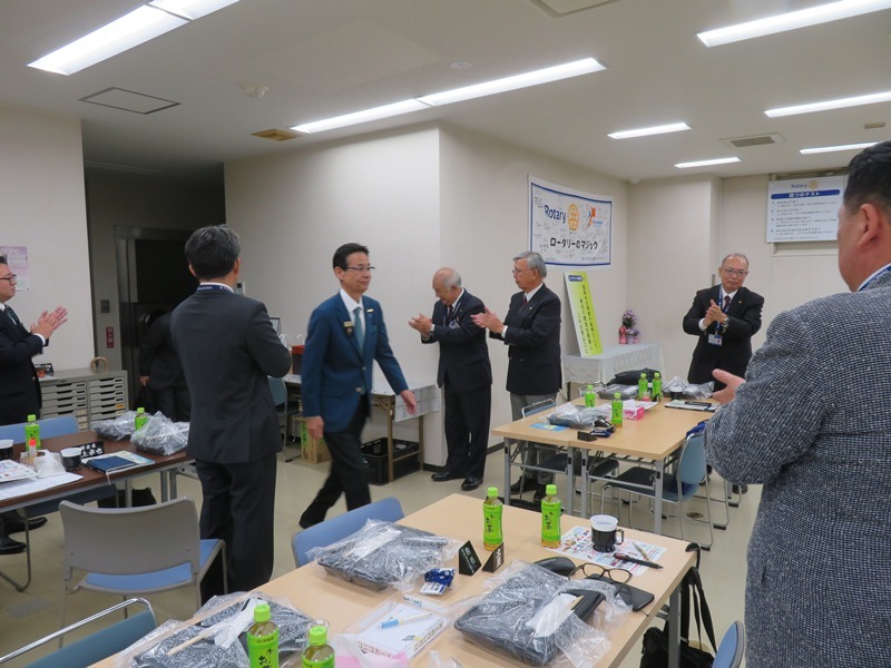 奥山会長新任挨拶 青山ガバナー補佐新任挨拶 新旧会長幹事バッジ交換